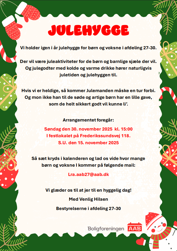 Vi ser frem til julearrangementet d. 30. november, hvor vi sammen med vores naboer i afdeling 27 mødes til julegodter og varme drikke ☕🎅🎄